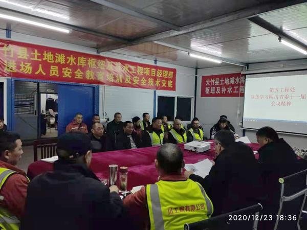 2020年12月23日,第五工程處在承建的大竹縣土地灘水庫樞紐及補水工程項目部召開職工大會,宣傳學習四川省委十一屆八次全會精神和周永開等全國優(yōu)秀共 產(chǎn) 黨員先進事跡及中共中央、國務(wù)院關(guān)于表彰全國勞動模范和先進工作者的決定。會議由第五工程處處長陳道剛主持。