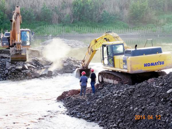 正午時分,整個工地機械轟鳴,6臺挖掘機、4臺裝載機、6輛20t自卸汽車往來穿梭,抓緊進行圍堰填筑。隨著兩岸戧堤的逐步進占,河道由寬變窄,最后形成一個寬約3米的龍口,往日平靜的涪江現在卻白浪翻滾,咆哮著奔出龍口。由于上游電站泄洪,導致河水水位陡增,用于截流的大塊石瞬間被沖出裹頭,最后3米的龍口始終無法合龍。面對前期準備的截流材料用盡,現場附近又沒有大塊石材的急情,四處領導果斷采取措施,命令截流施工人員將鋼橋板投入江中用于擋水截流,挖掘機不斷地向橋板上游投入石料。至晚上8時,二期圍堰終于順利合龍。
