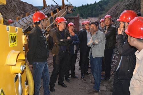 董蜀良一行在局長助理、四處處長茍仕聰、書記佘玉朝、副處長孫紹陽等陪同下對西梓干渠工程的建設情況進行考察。茍仕聰就目前工程進展情況和掘進機的使用情況做了詳細介紹。