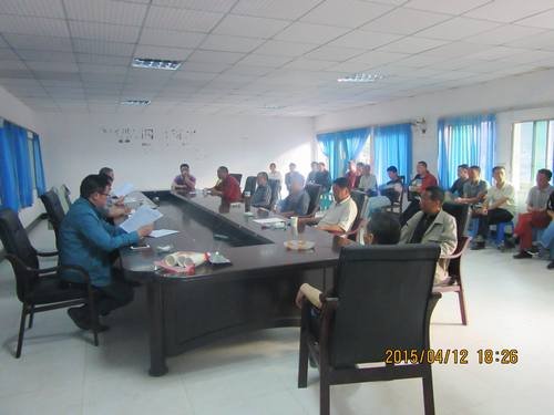 2015年4月12日,第一工程處在云南省鹽津縣萬年橋電站項目部組織職工傳達學習工程局2015年工作會議精神,第一工程處范雪山處長主持會議。