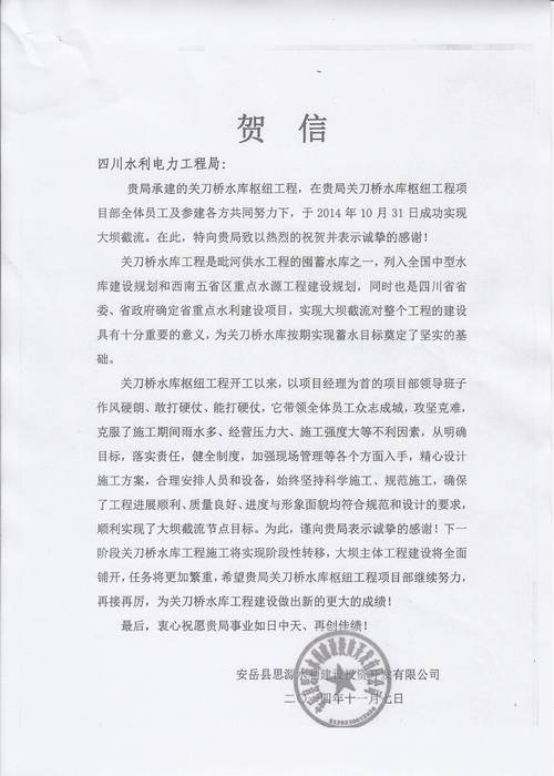 安岳縣思源水利建設(shè)投資開發(fā)有限公司致工程局賀信