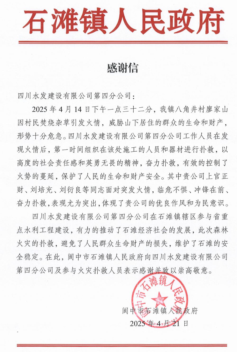 近日,四分公司收到閬中市石灘鎮(zhèn)人民政府感謝信,對四分公司扎根地方建設(shè)、積極履行社會責任給予高度認可,對其在危急時刻勇救山火、守護群眾生命財產(chǎn)安全表達誠摯感謝,并對四分公司職工展現(xiàn)出的社會責任感與英勇精神予以特別表彰。