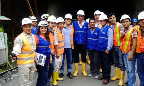 截流儀式之前,厄瓜多爾副總統(tǒng)率學(xué)生團(tuán)隊(duì)到我部施工的地下廠房、尾調(diào)室及交通洞進(jìn)行了視察,對(duì)項(xiàng)目工程質(zhì)量、安全、進(jìn)度給予了高度評(píng)價(jià)和肯定,并與該項(xiàng)目中厄員工合影留念。